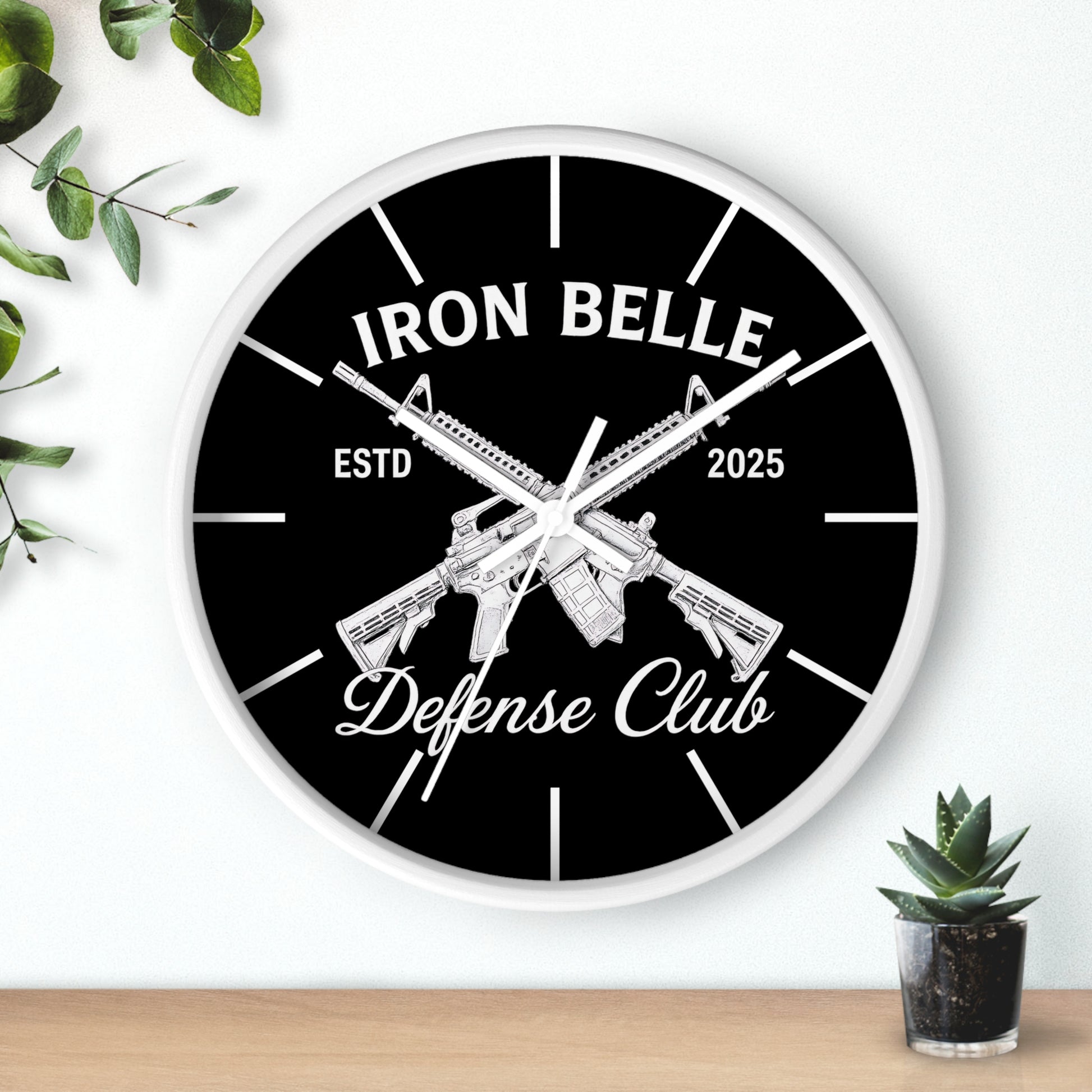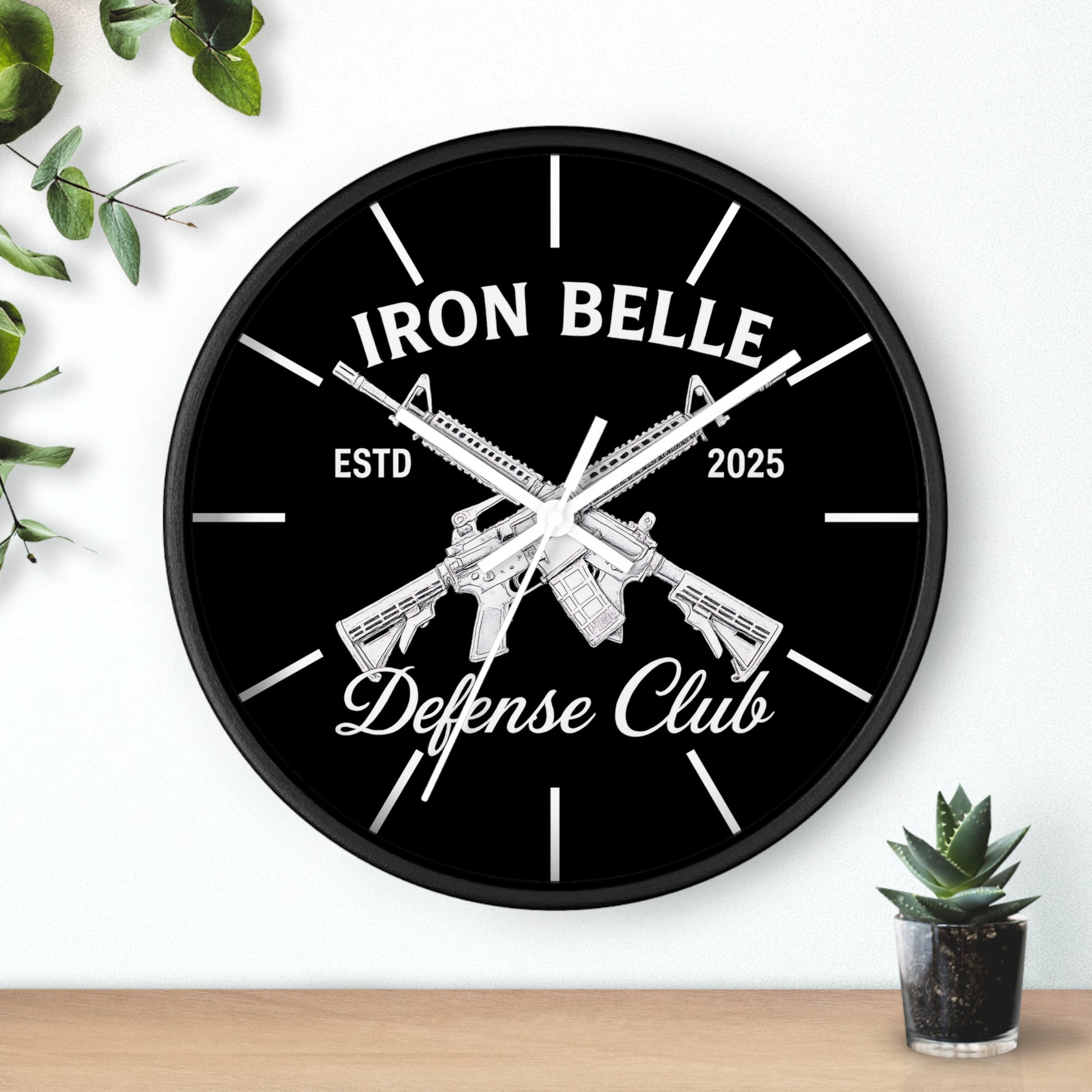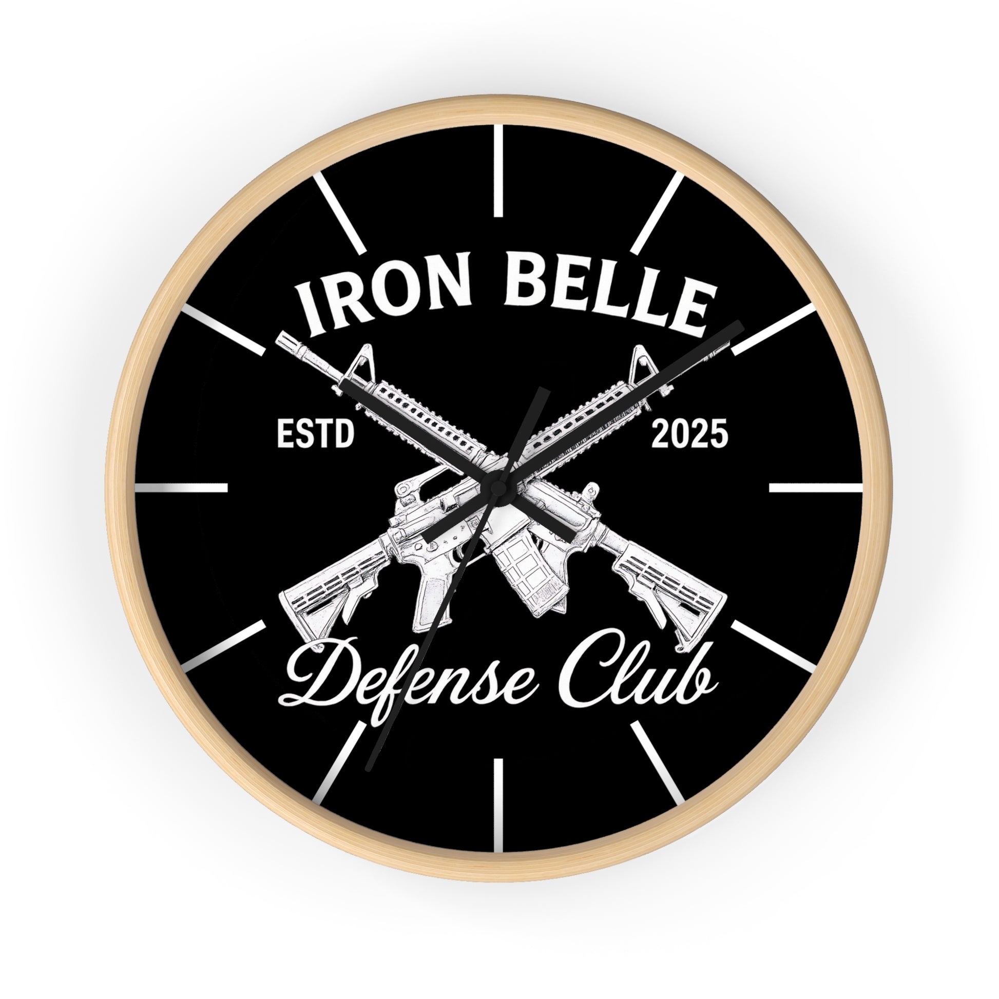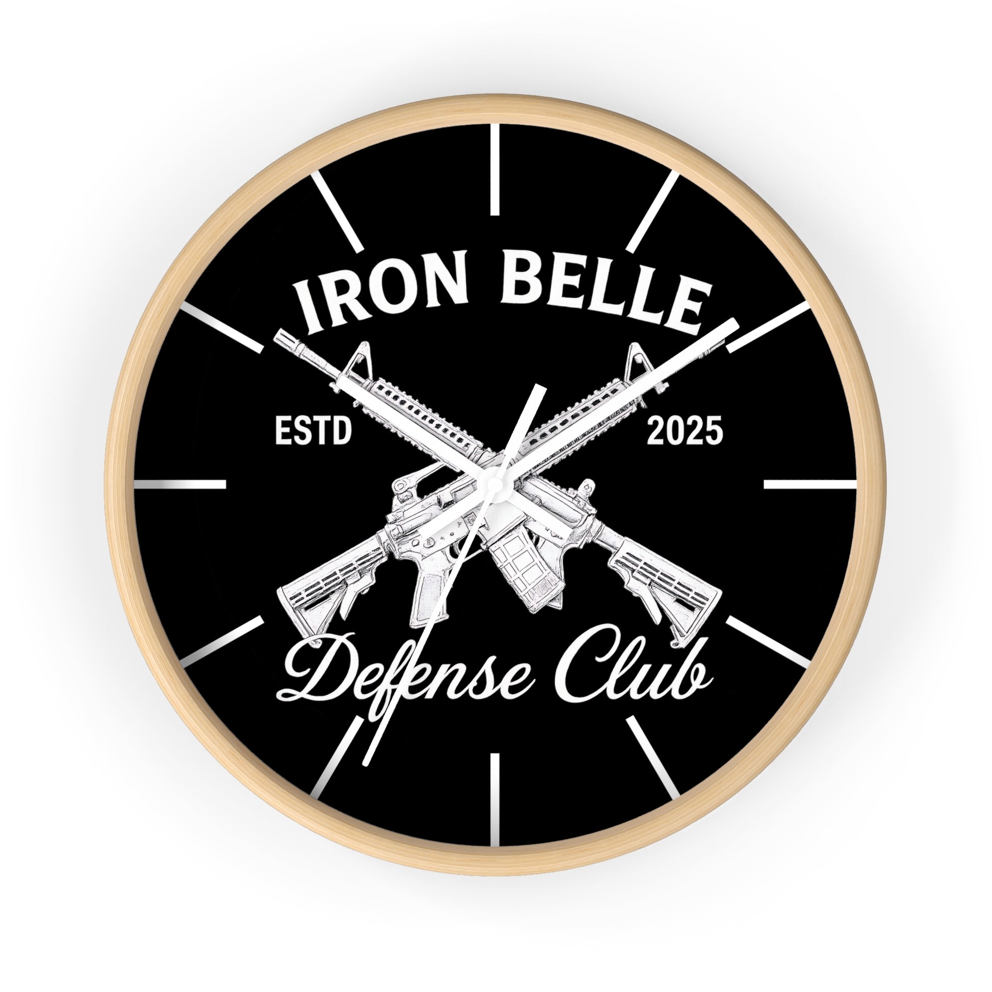 This bold wall clock combines sharp, high-contrast graphics with a clean, modern frame to make a clear statement on your wall. The black-and-white design centers on crossed rifles and strong lettering that read “Iron Belle — Defense Club,” giving the piece a rugged, purposeful feel. Its silent mechanism keeps ticking out of earshot, while vivid printing on a plexiglass face preserves every detail of the artwork. Hang it in an entryway, workshop, home office, or shooting-range lounge where its confident aesthetic sets the tone and marks time with low-key authority.