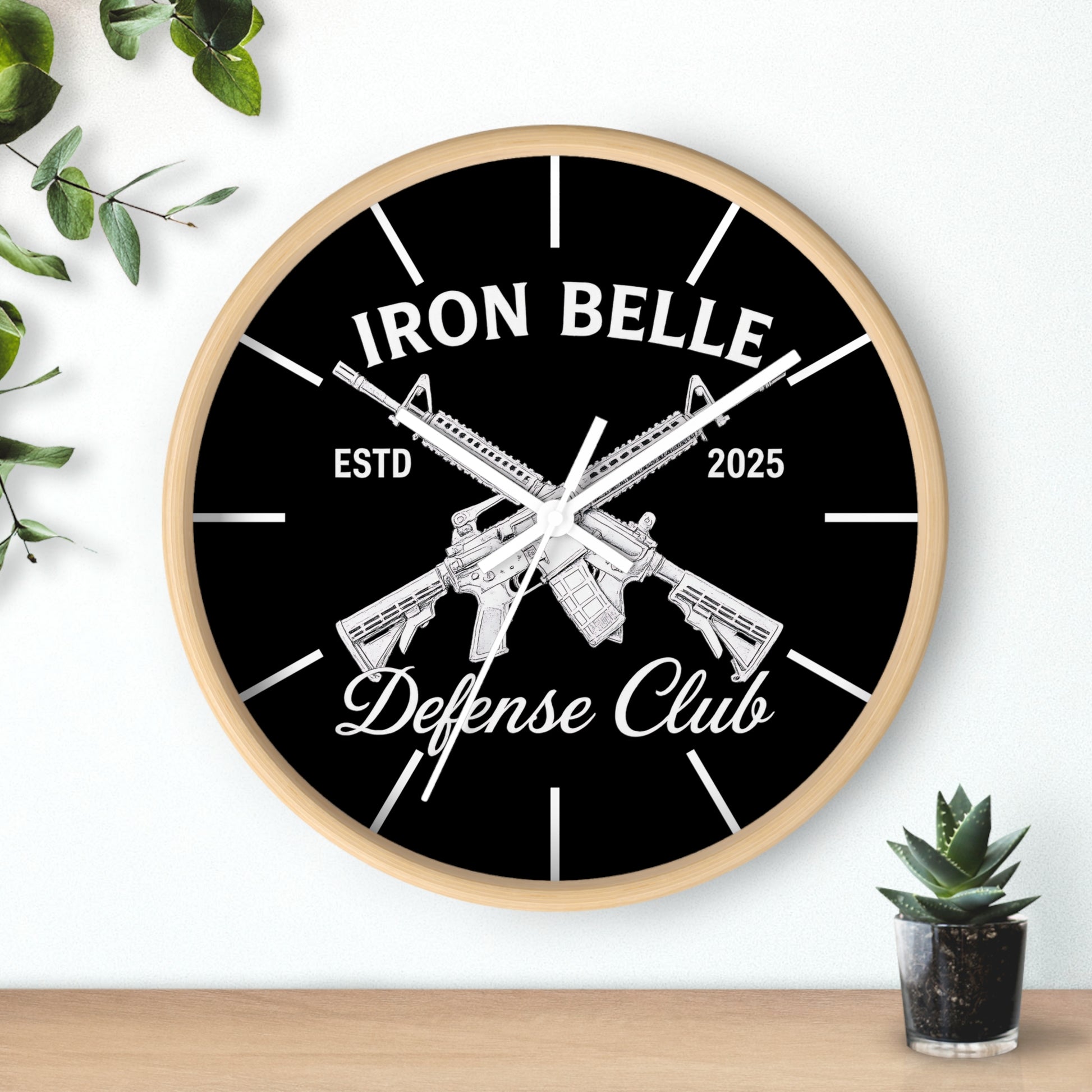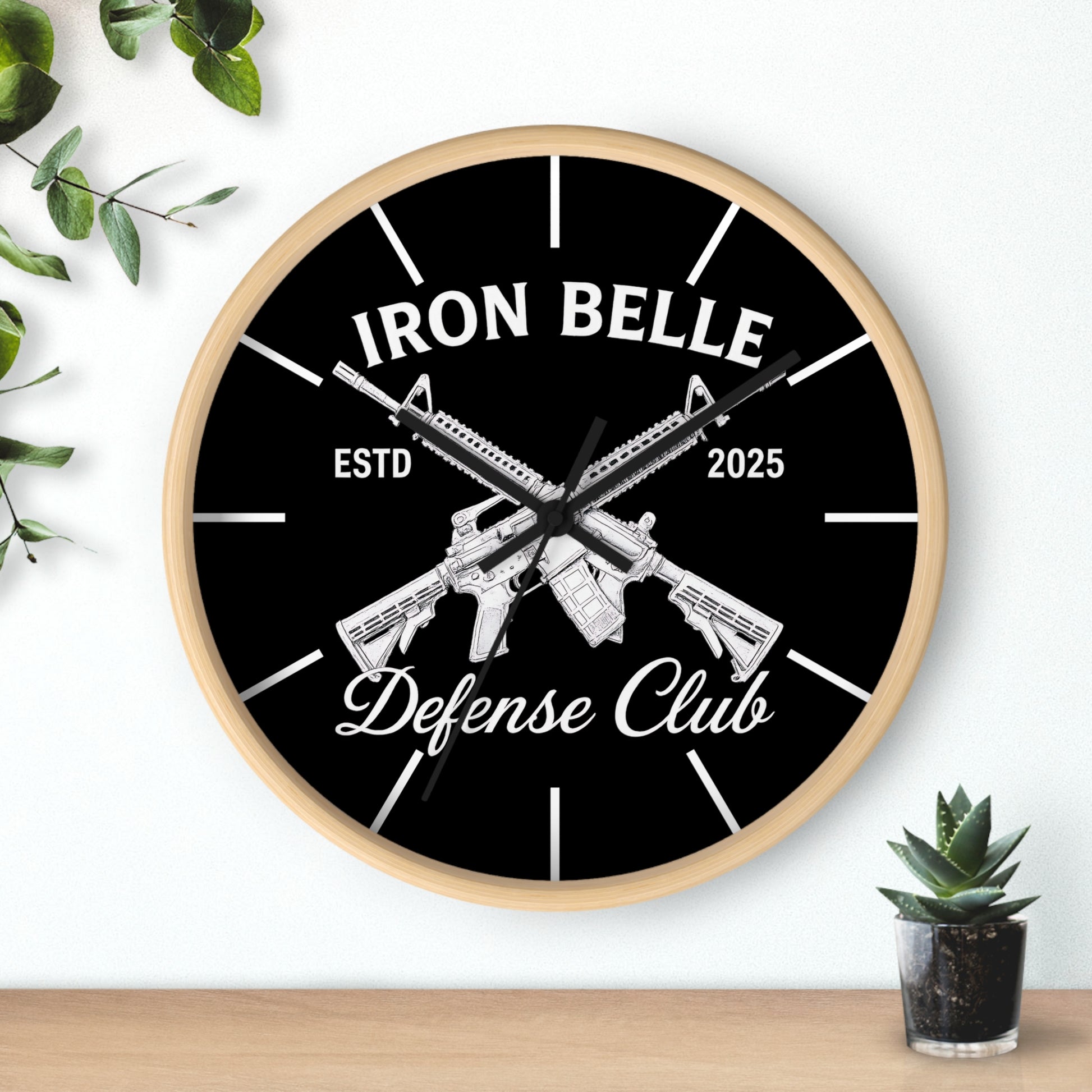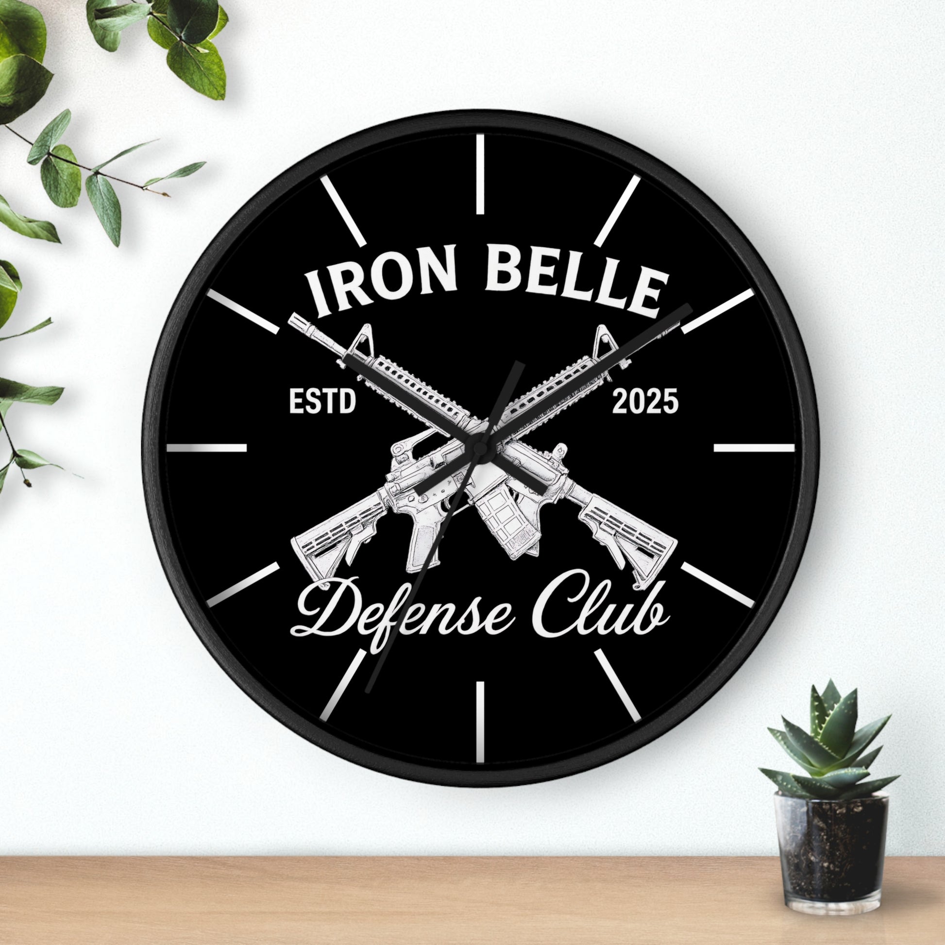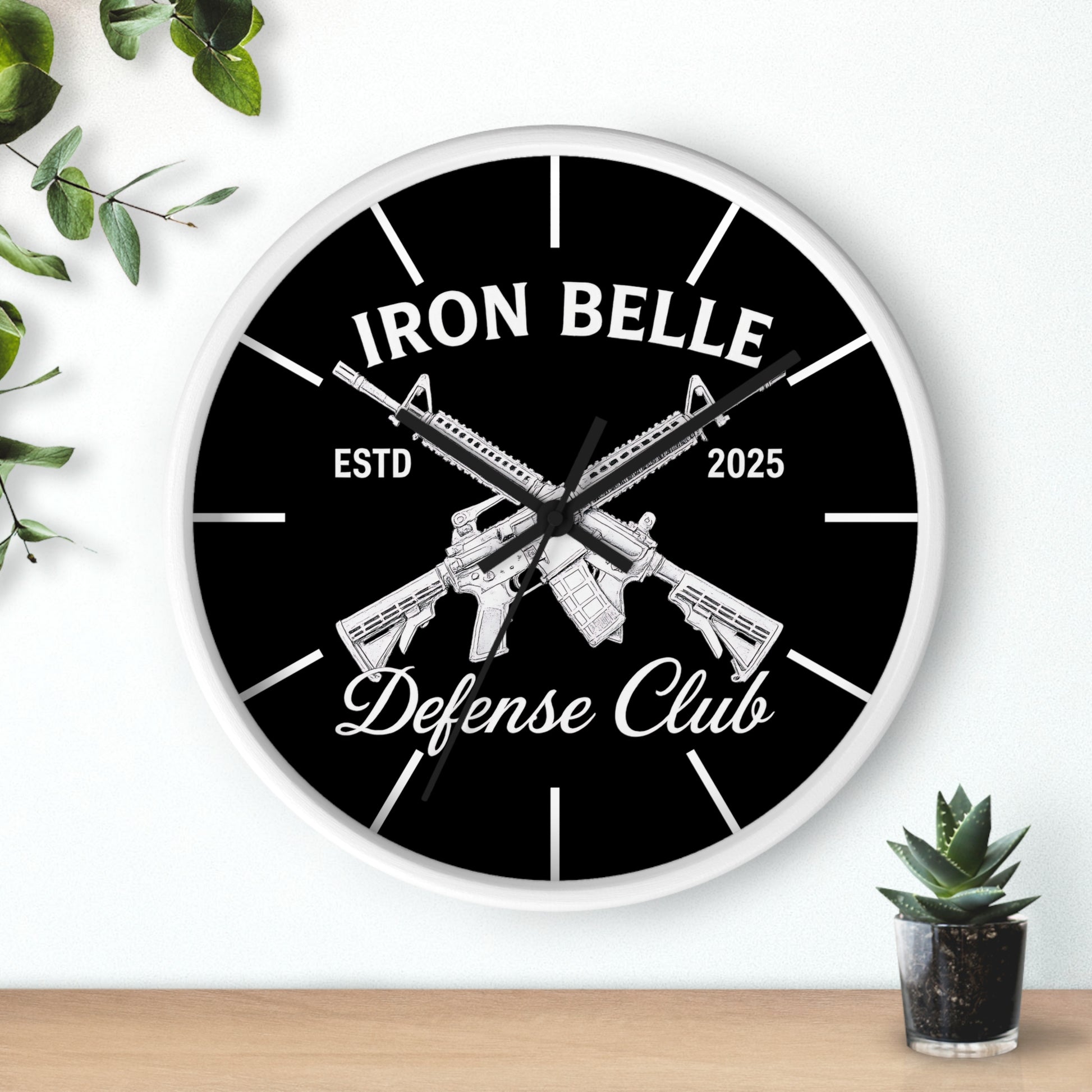This bold wall clock combines sharp, high-contrast graphics with a clean, modern frame to make a clear statement on your wall. The black-and-white design centers on crossed rifles and strong lettering that read “Iron Belle — Defense Club,” giving the piece a rugged, purposeful feel. Its silent mechanism keeps ticking out of earshot, while vivid printing on a plexiglass face preserves every detail of the artwork. Hang it in an entryway, workshop, home office, or shooting-range lounge where its confident aesthetic sets the tone and marks time with low-key authority.