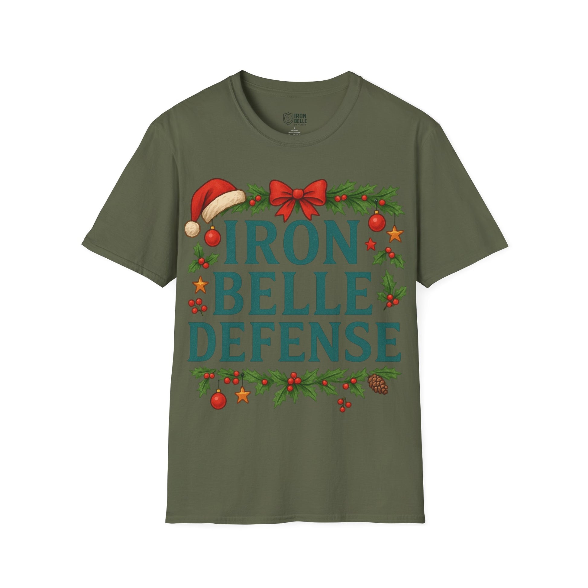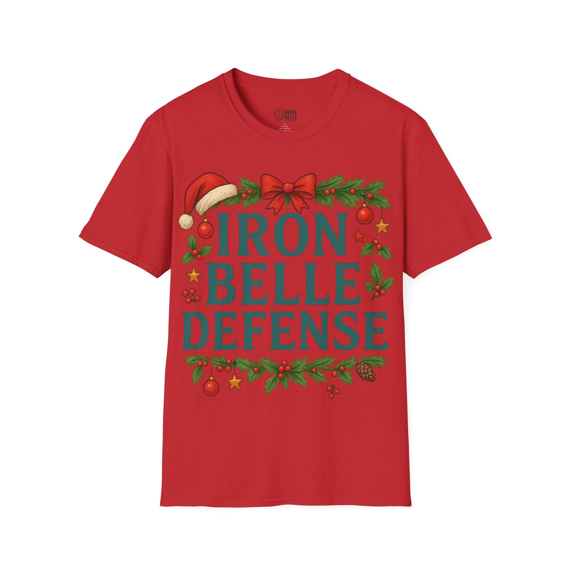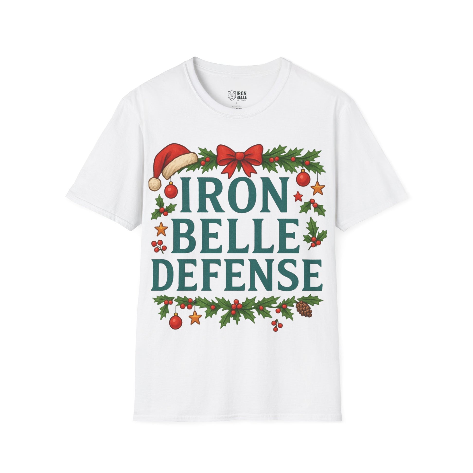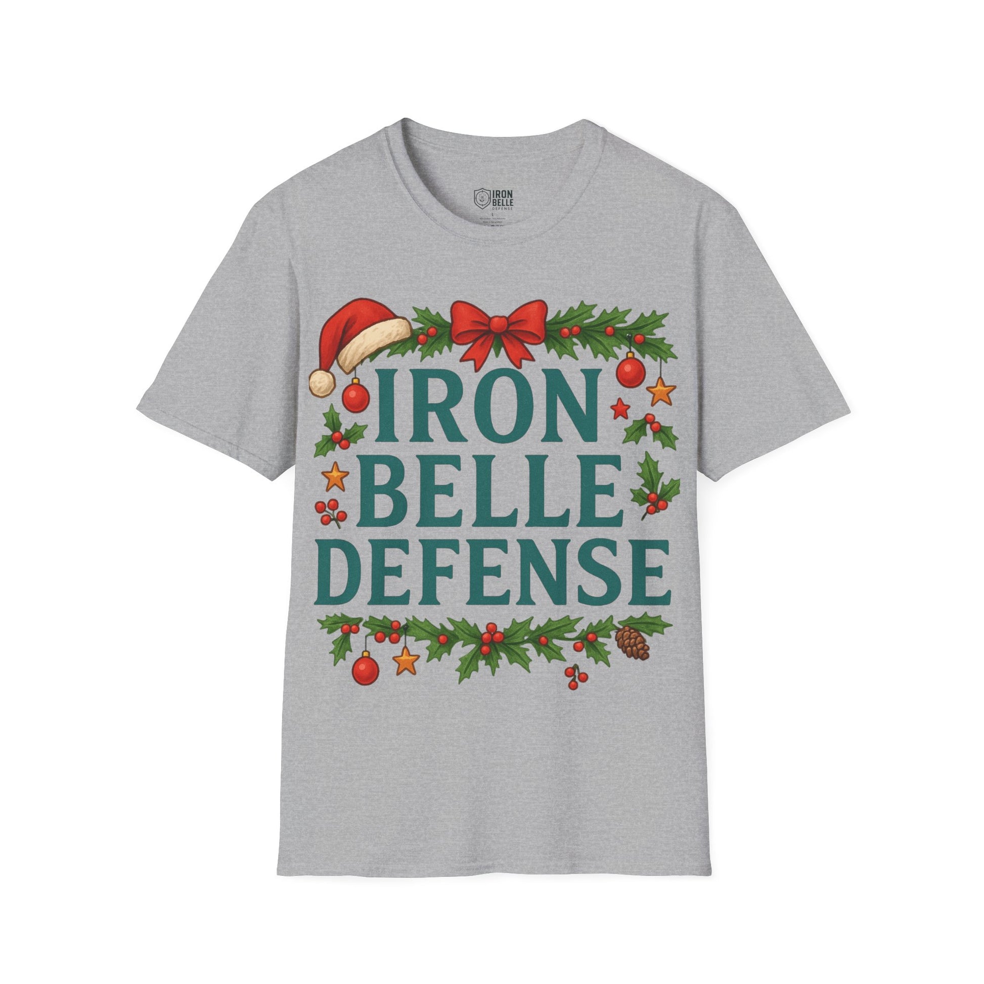 Lightweight and breathable, this soft cotton tee wears like a cozy nod to holiday traditions and spirited fandom. Bold, block lettering reads “IRON BELLE DEFENSE” framed by garlands, holly, pine cones and ornaments — a playful mix of athletic pride and seasonal cheer. The crew neckline and classic fit keep the silhouette clean so the festive design stands front and center, whether layered under a jacket or worn on its own during games, tailgates, or winter gatherings. It feels soft against skin, holds its shape, and arrives ready to be worn straight from the closet to the stands or the family party.