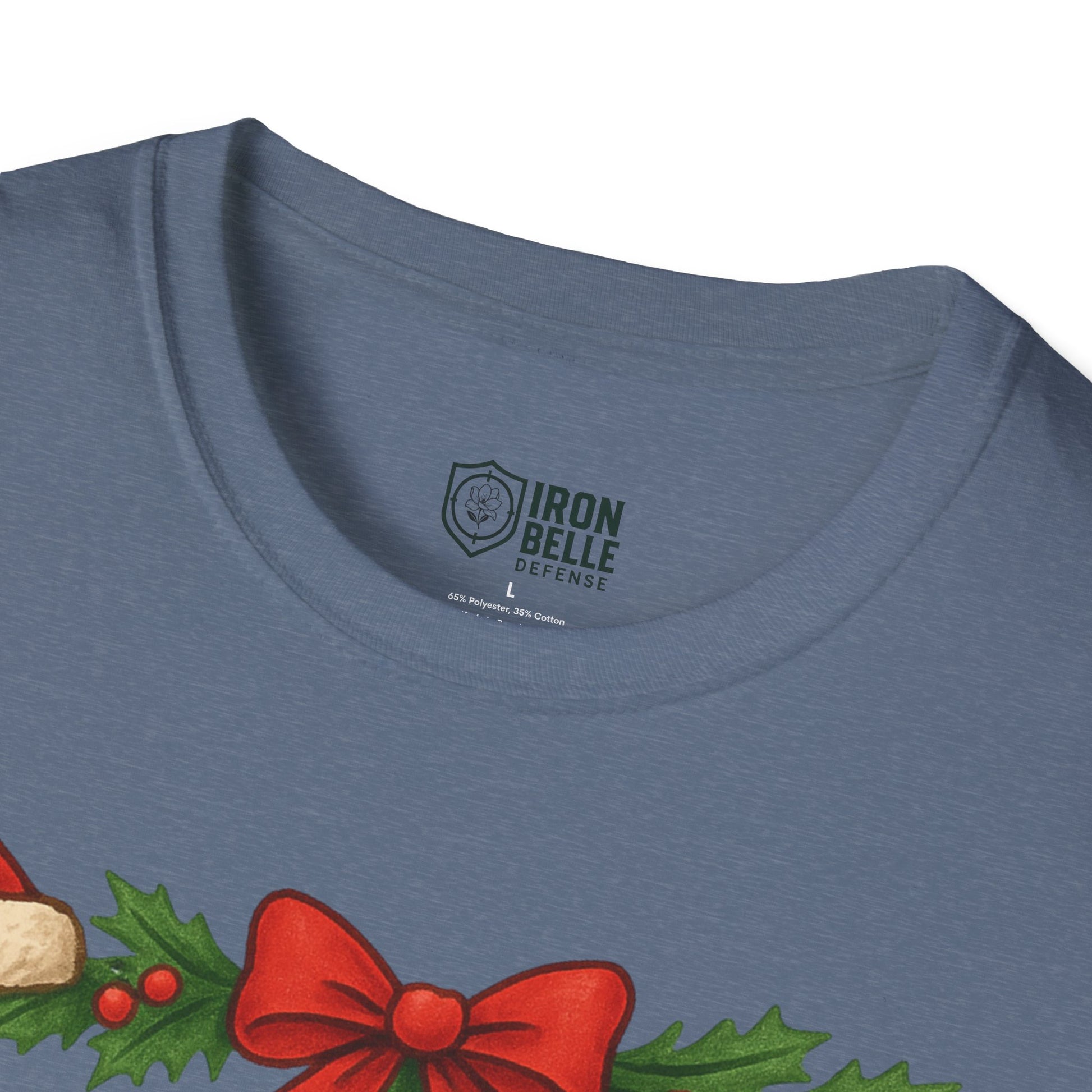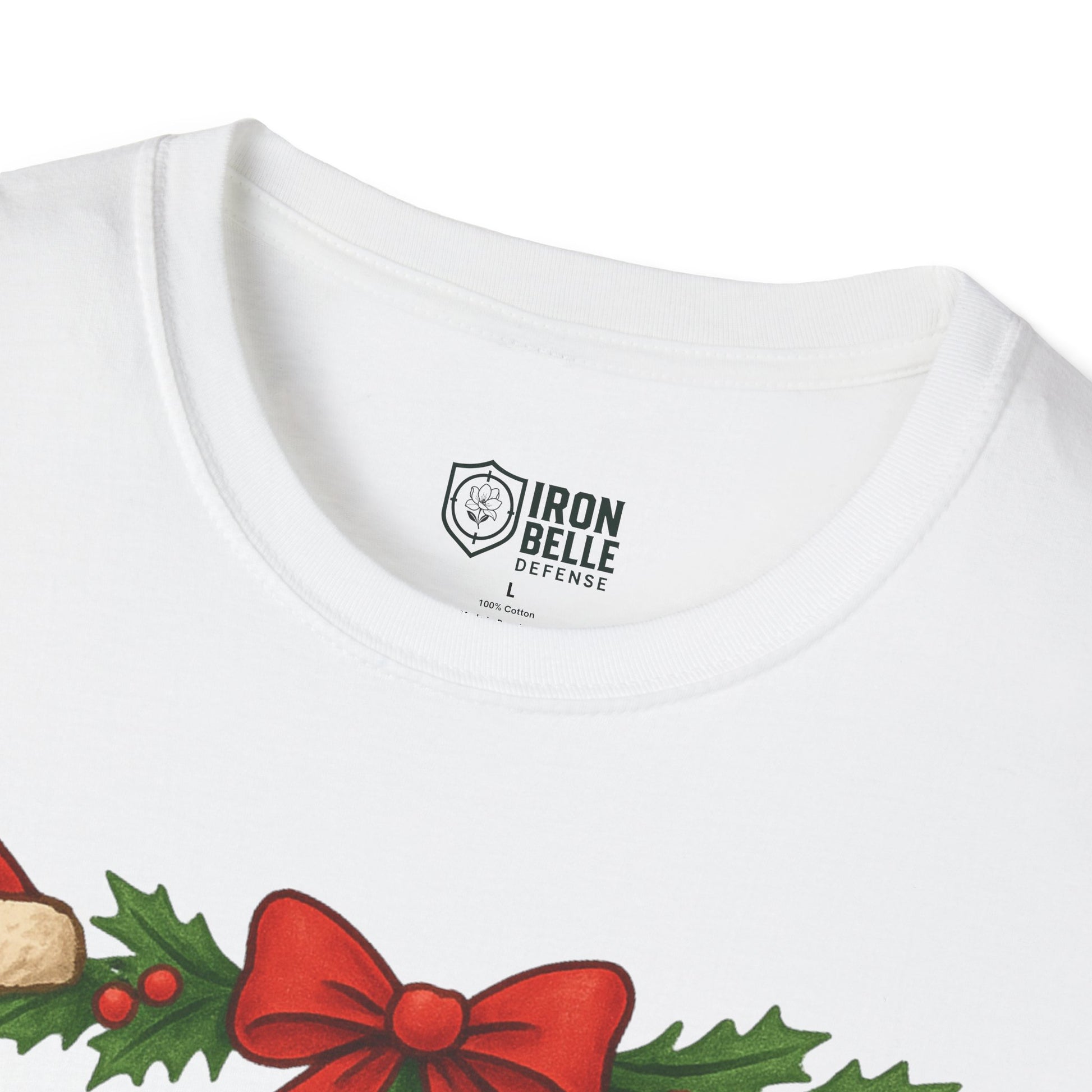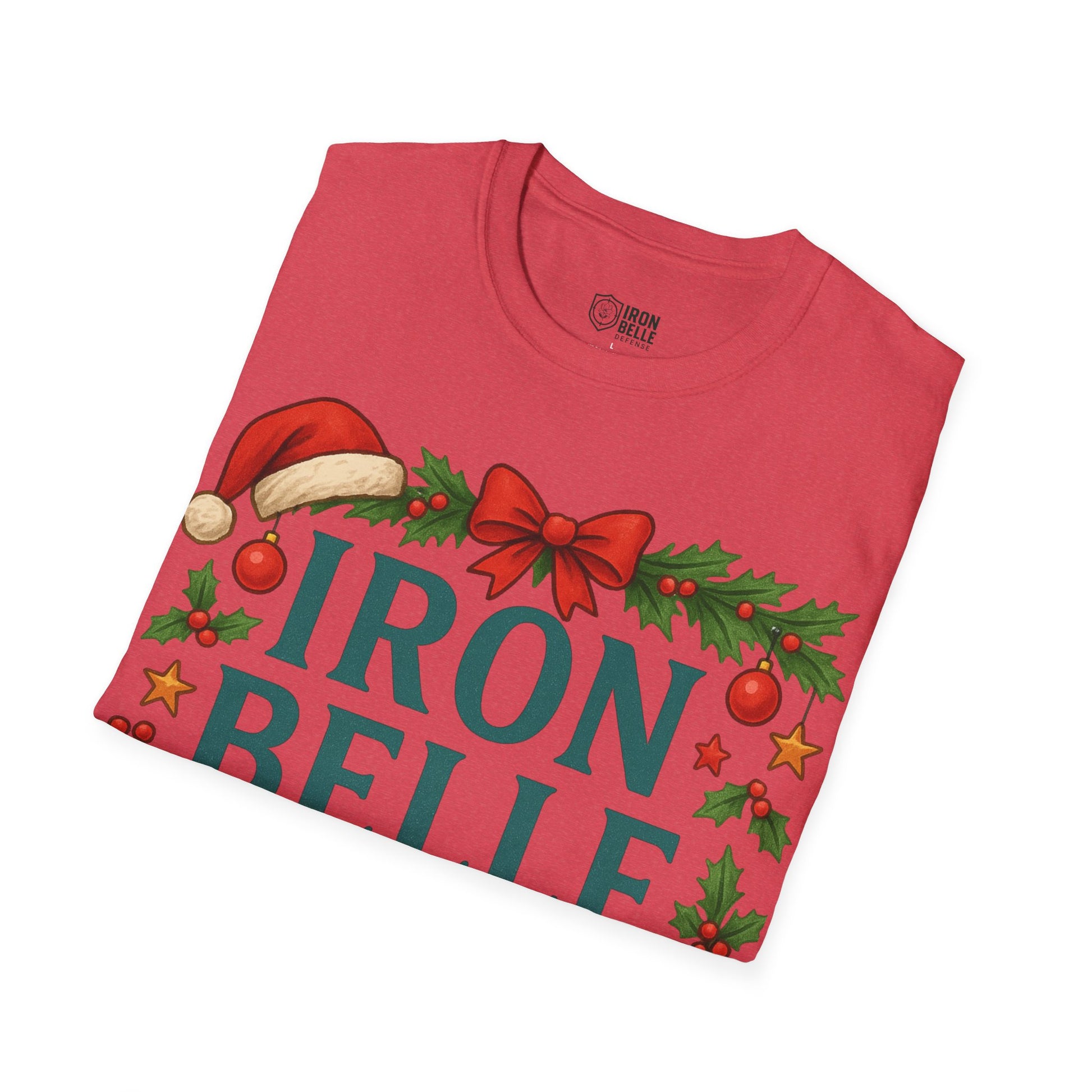 Lightweight and breathable, this soft cotton tee wears like a cozy nod to holiday traditions and spirited fandom. Bold, block lettering reads “IRON BELLE DEFENSE” framed by garlands, holly, pine cones and ornaments — a playful mix of athletic pride and seasonal cheer. The crew neckline and classic fit keep the silhouette clean so the festive design stands front and center, whether layered under a jacket or worn on its own during games, tailgates, or winter gatherings. It feels soft against skin, holds its shape, and arrives ready to be worn straight from the closet to the stands or the family party.