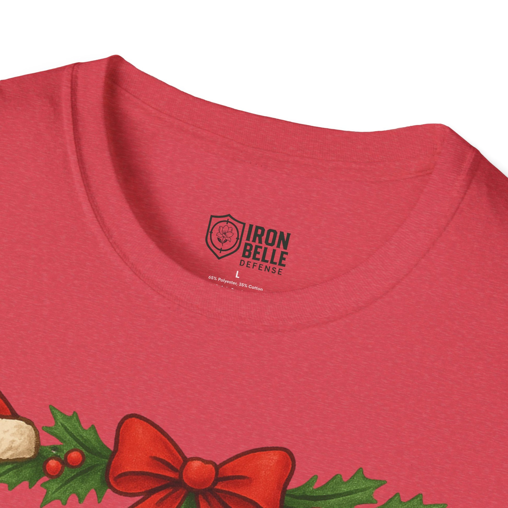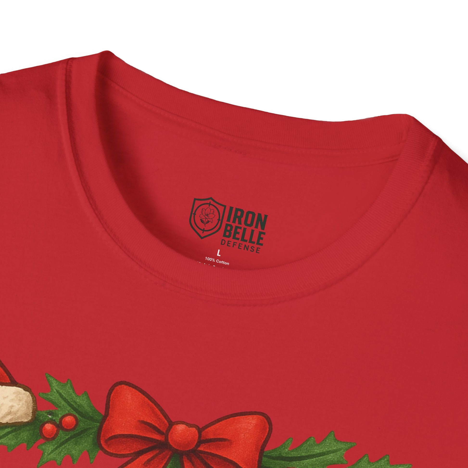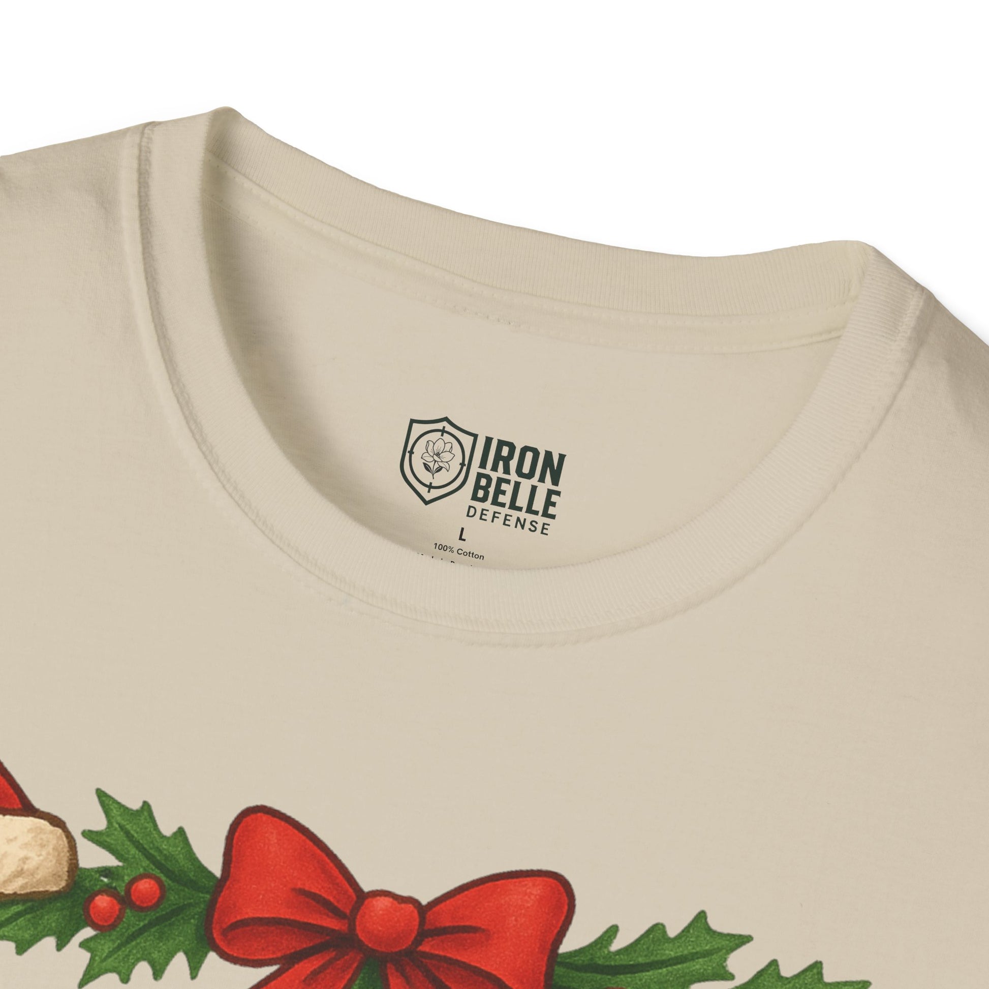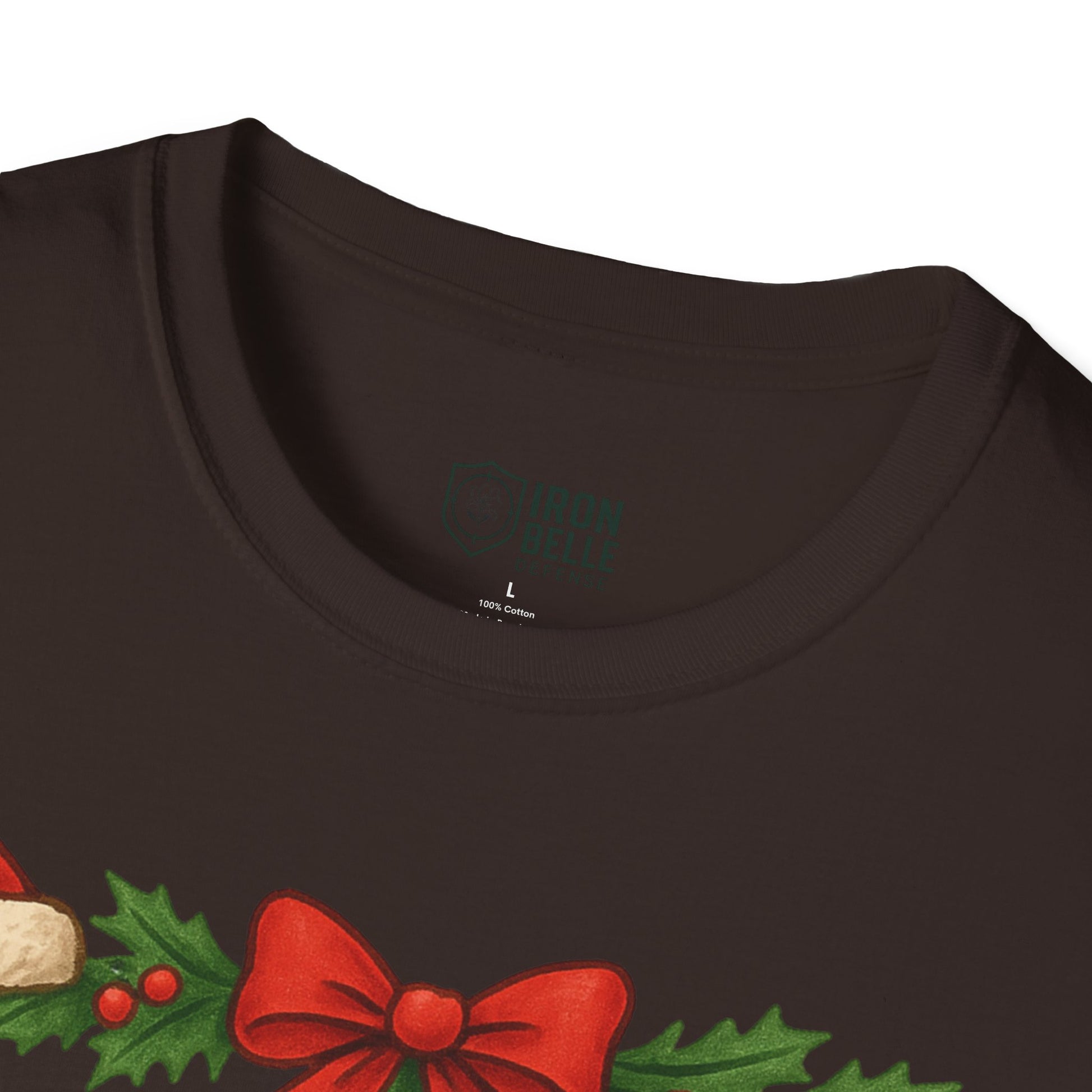 Lightweight and breathable, this soft cotton tee wears like a cozy nod to holiday traditions and spirited fandom. Bold, block lettering reads “IRON BELLE DEFENSE” framed by garlands, holly, pine cones and ornaments — a playful mix of athletic pride and seasonal cheer. The crew neckline and classic fit keep the silhouette clean so the festive design stands front and center, whether layered under a jacket or worn on its own during games, tailgates, or winter gatherings. It feels soft against skin, holds its shape, and arrives ready to be worn straight from the closet to the stands or the family party.
