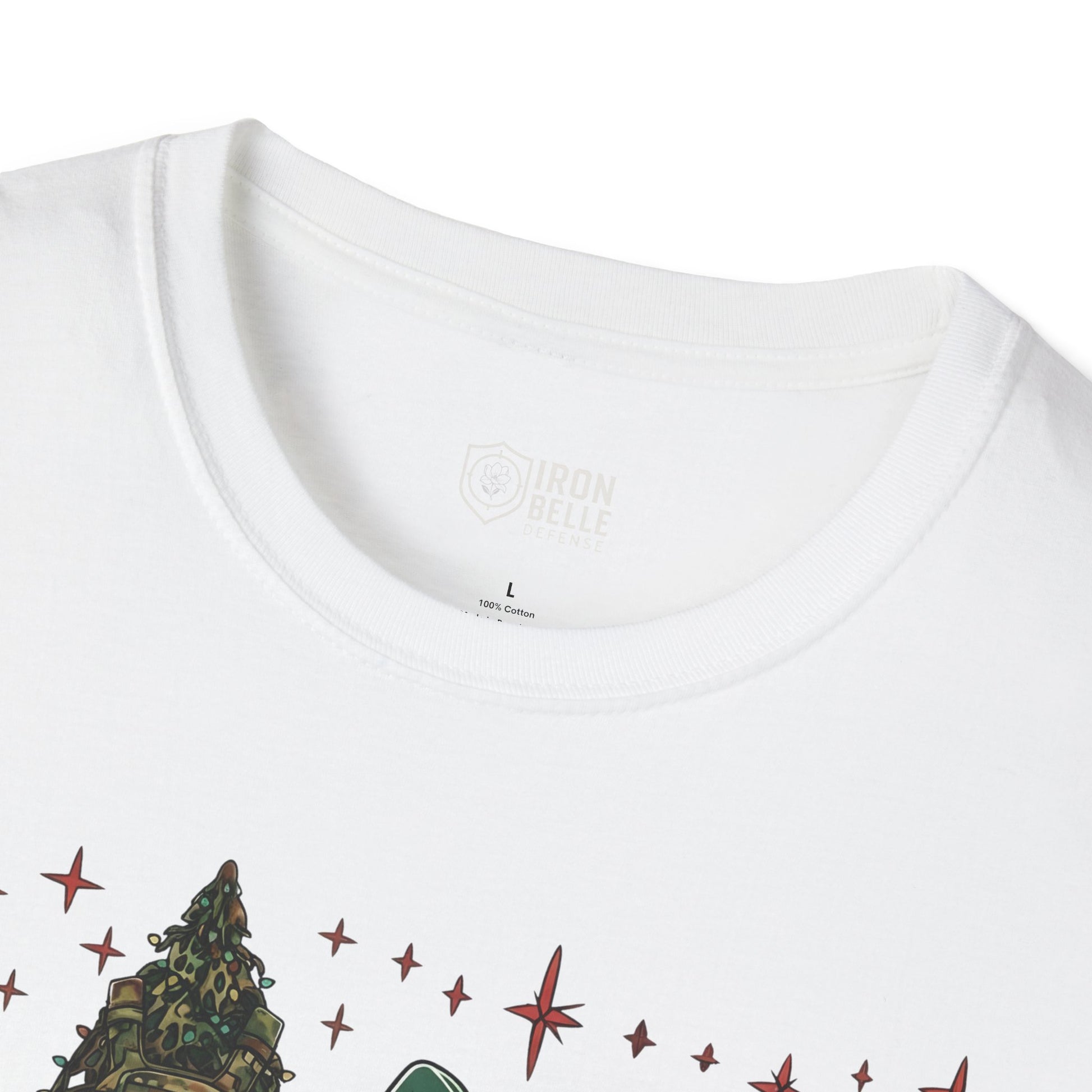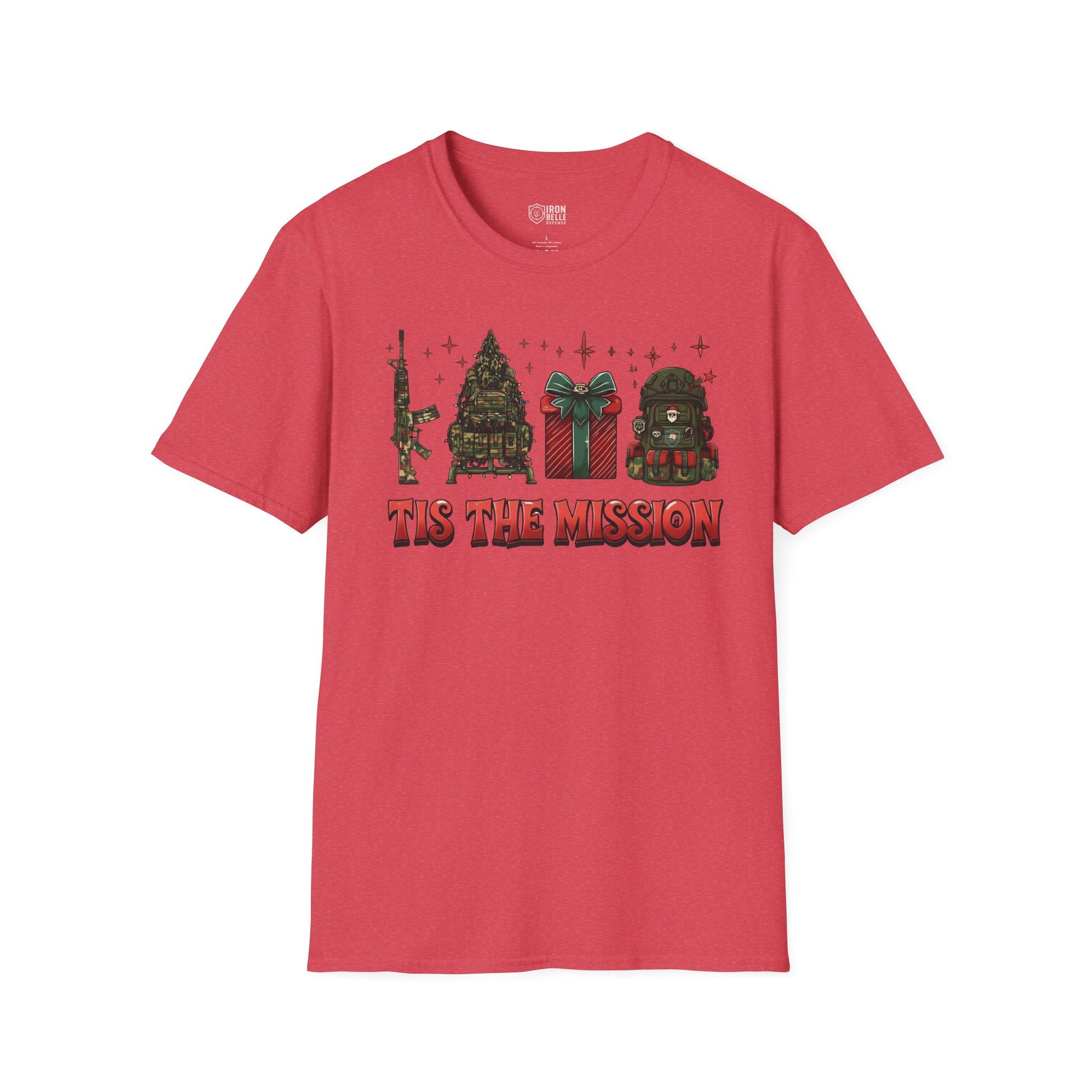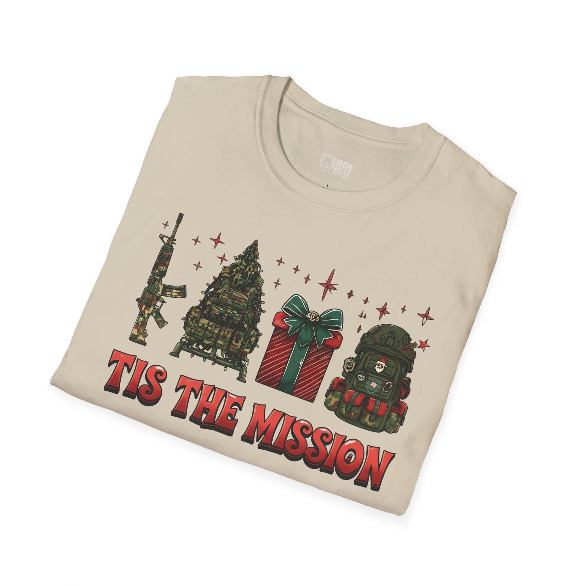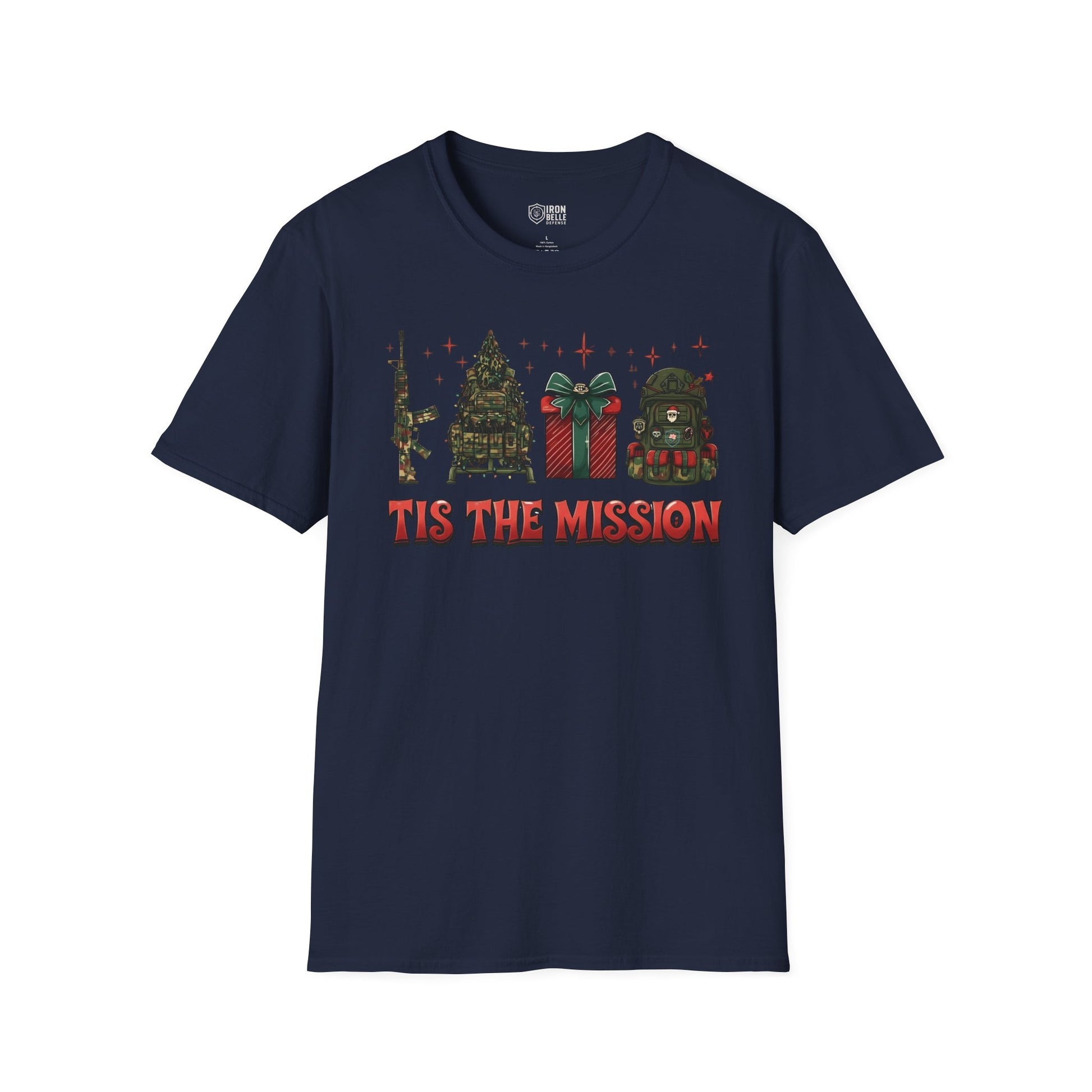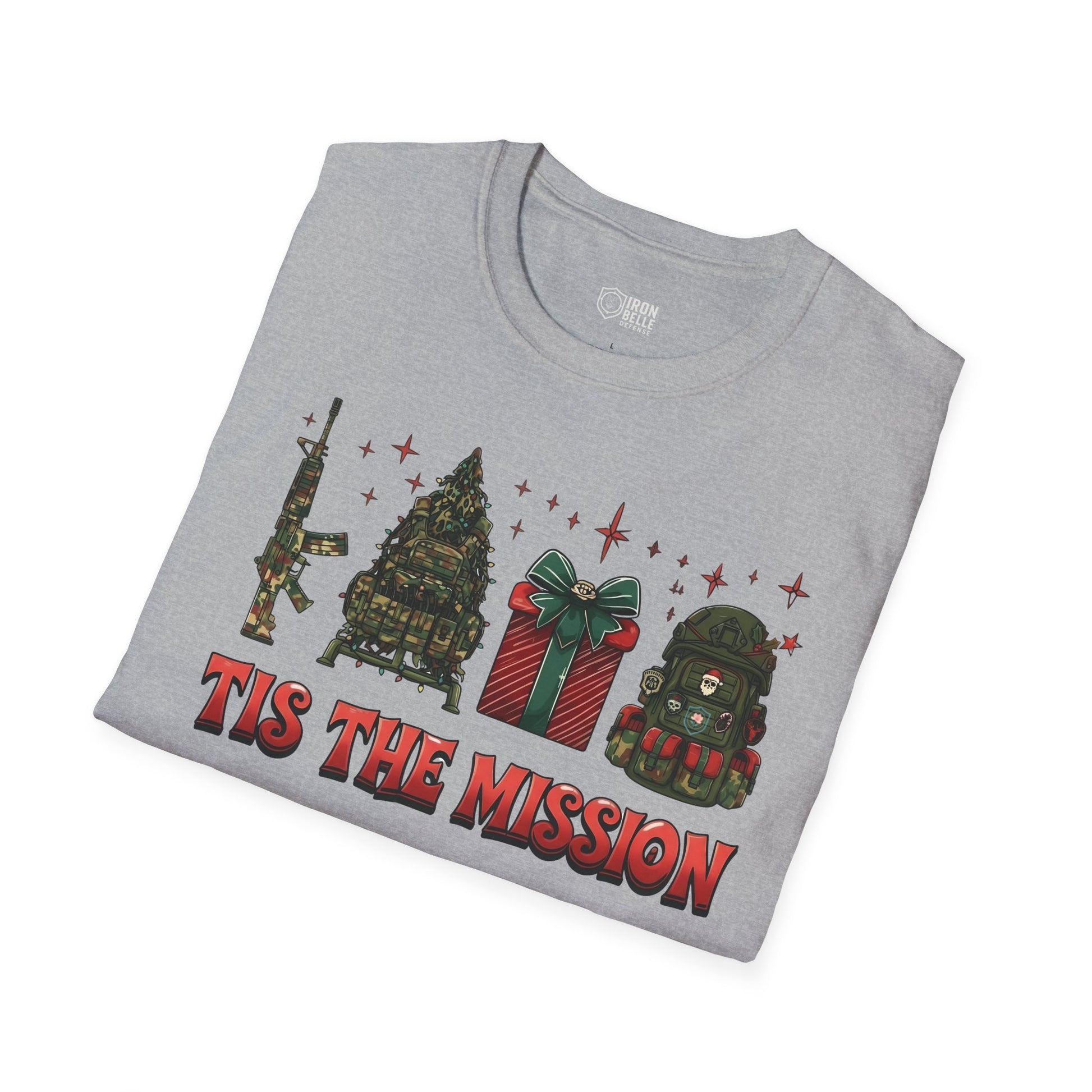 This lightweight crew-neck tee brings a sharp, playful twist to holiday wear. The front print stitches together tactical imagery—a rifle silhouette, camo Christmas tree, wrapped present, and a helmet—under bold lettering that reads “Tis the Mission.” It sits relaxed on the chest, letting the design read clearly without feeling crowded. Wear it layered under a field jacket for outdoor runs, or with jeans and boots for casual meetups with friends who speak the same language: mission-focused, outdoorsy, and a little irreverent. The soft ring-spun cotton feels smooth against skin and breathes easily, so it stays comfortable from daytime patrols to late-night gatherings. Subtle details like a tear-away label and reinforced shoulder tape keep the fit steady and comfortable through repeated wear. If you move between range days, weekend hikes, and holiday hangouts, this tee blends the practical with seasonal attitude in a way that feels authentic rather than flashy.